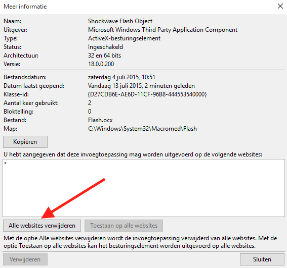 Je kunt ook plugins op click-to-play zetten in Internet Explorer. Klik rechts op de gewenste plugin en kies Meer informatie. Daarna klik je op de knop Alle websites verwijderen waarmee je toestemming van de plugin intrekt om uitgevoerd te worden op websites.