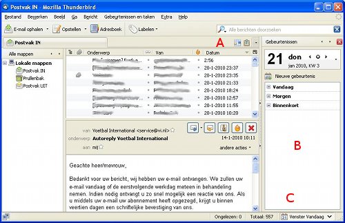 Lightning is goed geïntegreerd met Thunderbird. U kunt snel wisselen tussen agenda en taken door tabbladen te openen (A). En er is een Venster Vandaag met een kort overzicht van gebeurtenissen en taken (B). U kunt dit Venster Vandaag ook uitschakelen (C).