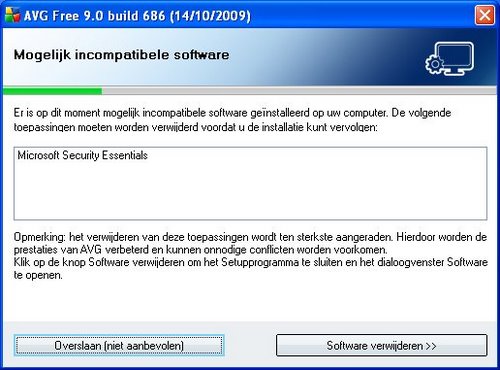 5. Als u een ander anti-virus-programma heeft draaien wordt u gevraagd deze eerste te de-installeren. Dit is inderdaad aan te bevelen. U kunt dit doen door te klikken op de knop Software verwijderen en u komt uit bij Configuratiescherm | Software in Windows waar u het programma opzoekt en op Verwijderen klikt. Als u dan gevraagd wordt de pc opnieuw te starten moet u daarna wellicht weer opnieuw beginnen met de installatie van AVG bij stap 2 hierboven.