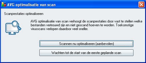 10. Het laatste scherm is nog wel van belang. Hierin biedt AVG aan om een optimalisatiescan uit te voeren. Deze eerste scan van uw pc kan ruim een uur duren (afhankelijk van de hoeveelheid bestanden op uw pc). Niet heel plezierig om gelijk een geheugenvretende scan uit te voeren, maar toch is het aan te raden dit wel te doen, aangezien AVG bij deze scan alle bekende systeembestanden van Windows die niet wijzigen bij een volgende scan overslaat. En dit kan een behoorlijke tijdwinst opleveren bij elke volgende scan van AVG.