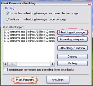 3. In het volgende venster gaan we eerst de Afbeeldingen toevoegen die we aan elkaar willen plakken. U kunt ze op de juiste volgorde zetten. Als ze goed staan klikt u op Maak Panorama