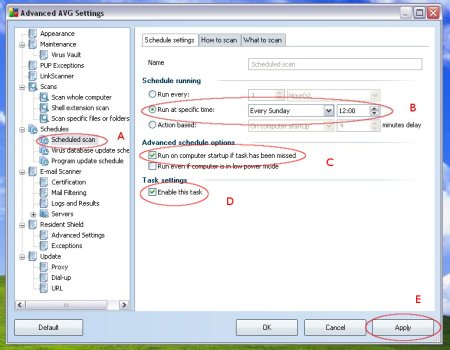 3. Klik op Scheduler | Scheduled scan (A) en verander onder het kopje Schedule running, na Run at specific time, de frequentie van Every day naar bijvoorbeeld Every Sunday (B). Zet een vinkje bij Run on computer startup if task has been missed (C) en controleer of er wel vinkje staat bij Enable this task (D)! Klik vervolgens op Apply en OK (E).