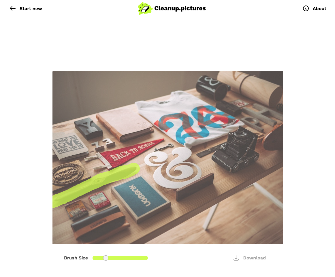 Cleanup.pictures is een open source en gratis online tool om snel storende elementen uit afbeeldingen te verwijderen. Het werkt heel eenvoudig: je uploadt een eigen foto en gebruikt een borstel (brush) om de persoon, het object of de oneffenheid die je storend vindt uit te vegen. Cleanup.pictures gaat dan aan de slag met het gemarkeerde voorwerp, persoon of tekst en probeert zo goed mogelijk de originele achtergrond te herstellen. Als je klaar bent kun je de foto weer downloaden.