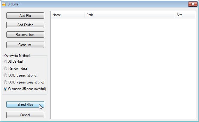 BitKiller is een open source programma met een zeer overzichtelijke interface. Je voegt bestanden of mappen toe via de Add File of Add Folder knoppen of sleept ze op het programmavenster van BitKiller. Daarna kies je een overschrijfmethode (hoe meer overschrijvingen, hoe grondiger bestanden verwijderd worden, maar hoe langer het ook duurt) en klik je op Shred Files. Hierna zijn de bestanden onherstelbaar vernietigd. Let dus goed op dat je de juiste bestanden uitwist, want deze actie kan niet ongedaan gemaakt worden!
