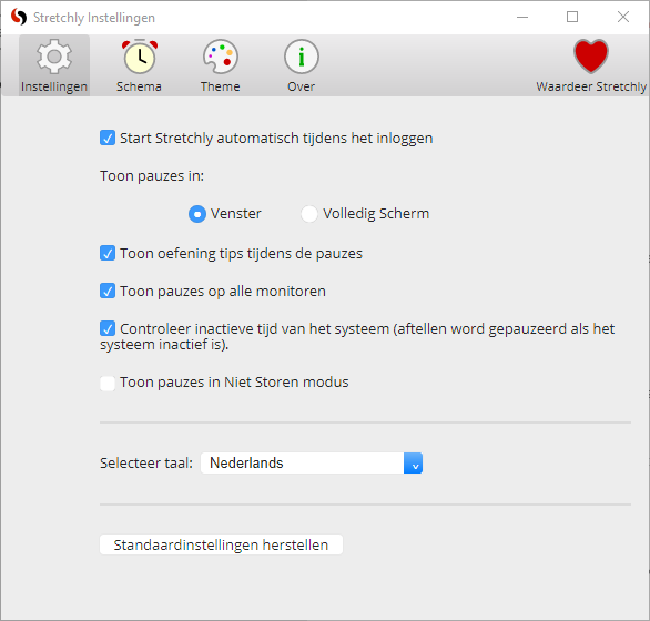 Je kunt dit onder Instellingen | Schema veranderen naar eigen voorkeuren. Handig is wel om nog even een vinkje te zetten bij Start Stretchly automatisch tijdens het inloggen: