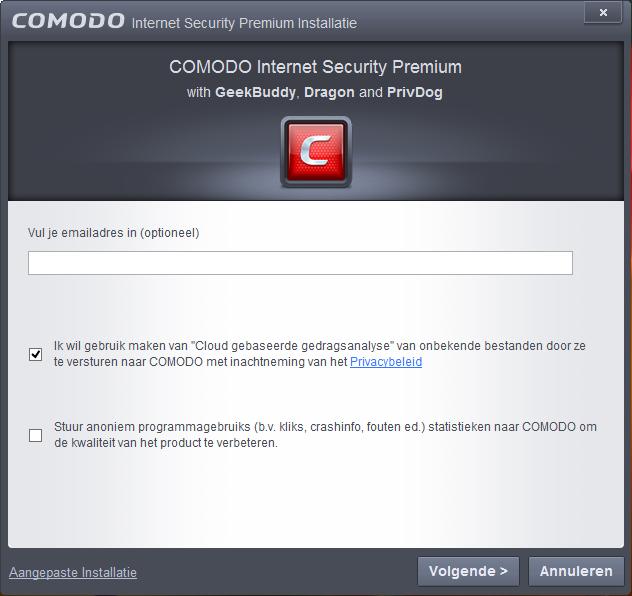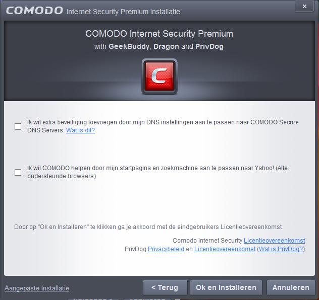 Een mail-adres invullen hoeft niet. En je wilt misschien geen gegevens naar Comodo sturen, niet gebruikmaken van de DNS-servers van Comodo en waarschijnlijk ook je startpagina en zoekmachine niet veranderen in Yahoo!