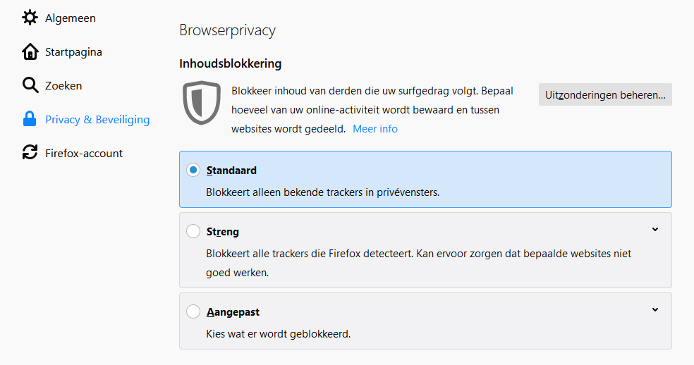 Als veel sites niet meer goed werken kun je altijd weer Standaard instellen om dit te verhelpen. Je kunt ook per site (als een site niet meer functioneert) de Inhoudsblokkering uitschakelen door op het schildje in de adresbalk te klikken (zie afbeelding) en dan op Blokkering voor deze website uitschakelen.