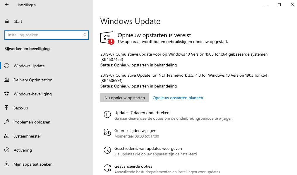 Steeds terugkerende melding dat pc opnieuw opgestart moet worden na de update. KB4507543 voor Windows 10 1903