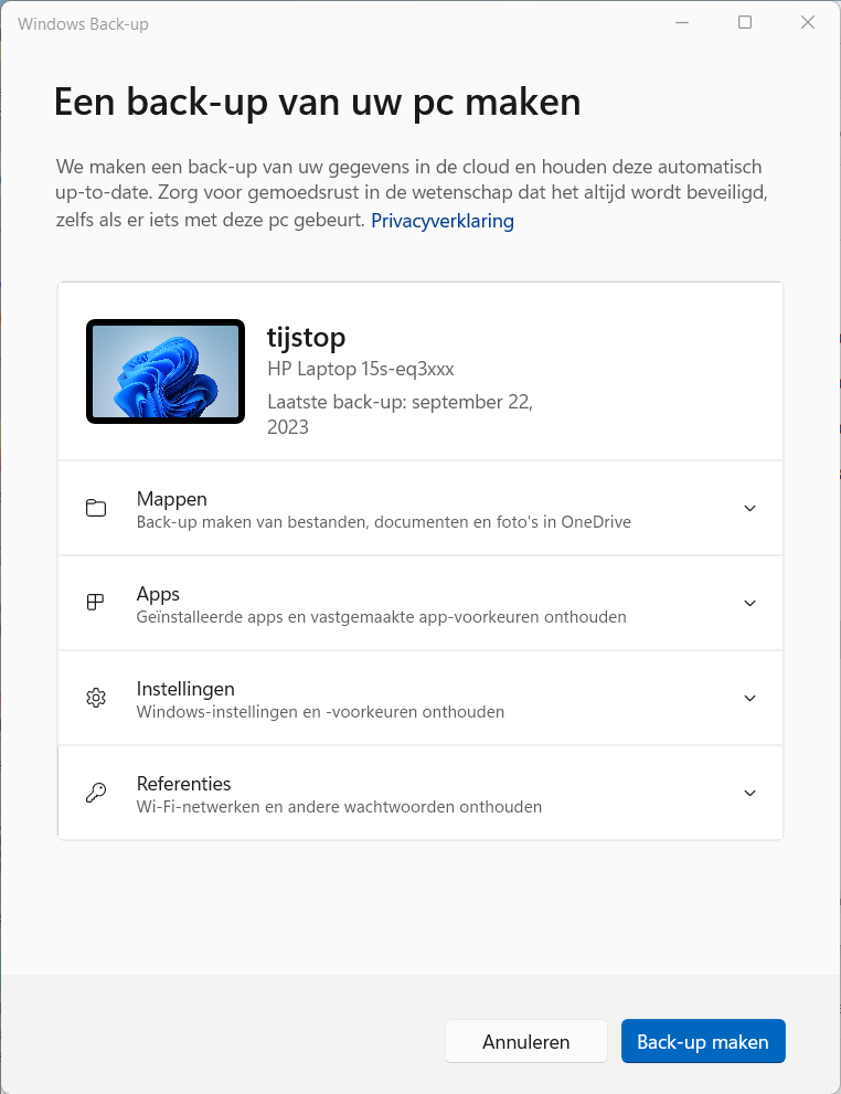 - Er is een nieuwe Backup-app voor Windows 11, net als laatst voor Windows 10. Je moet daarvoor wel voldoende OneDrive cloudopslag hebben (of extra ruimte kopen)