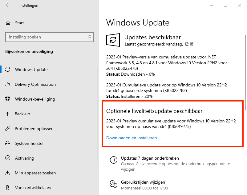 Preview update KB5019275 is alleen te verkrijgen als je naar Instellingen | Bijwerken en beveiliging | Windows Update gaat en op de Downloaden en installeren knop klikt onder het kopje Optionele kwaliteitsupdate beschikbaar.