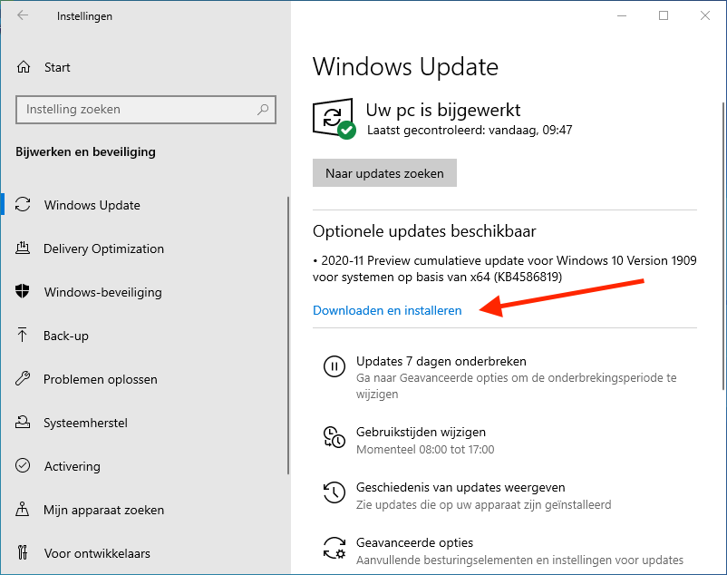 Klik op Downloaden en installeren onder het kopje Optionele updates beschikbaar: