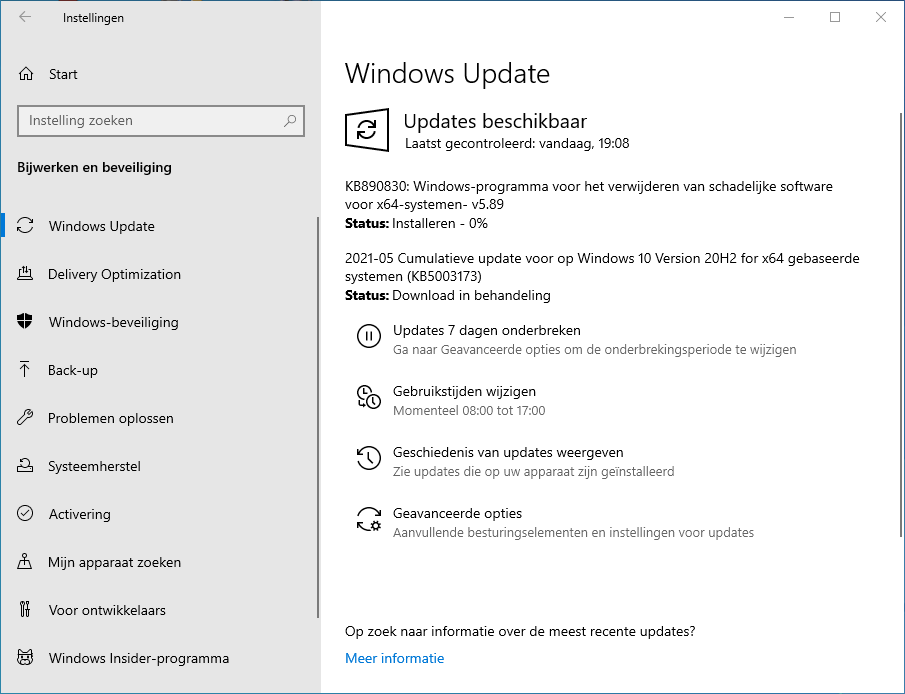 Daarna de Update Kb5003173 toegepast. Alles ging perfect, geen problemen ondervonden.