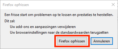 De snelste oplossing, die vaak je problemen in Firefox verhelpt, is het 'opfrissen' van Firefox. Hierbij worden add-ons (extensies) en extra zoekmachines verwijderd en instellingen teruggezet naar hun standaardwaarden. Na het opfrissen dien je wel zelf weer je eventuele extensies opnieuw te installeren en instellingen aan te passen (mocht je die gewijzigd hebben)!