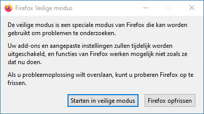 Je kunt dan proberen om Firefox in veilige modus te starten als je niet gelijk wilt opfrissen (zie 2 hierboven). Dit is NIET de veilige modus in Windows, maar de veilige modus van Firefox zelf. Hierbij worden extensies tijdelijk uitgeschakeld en bepaalde functies, zoals hardwareversnelling, tijdelijk uitgezet.