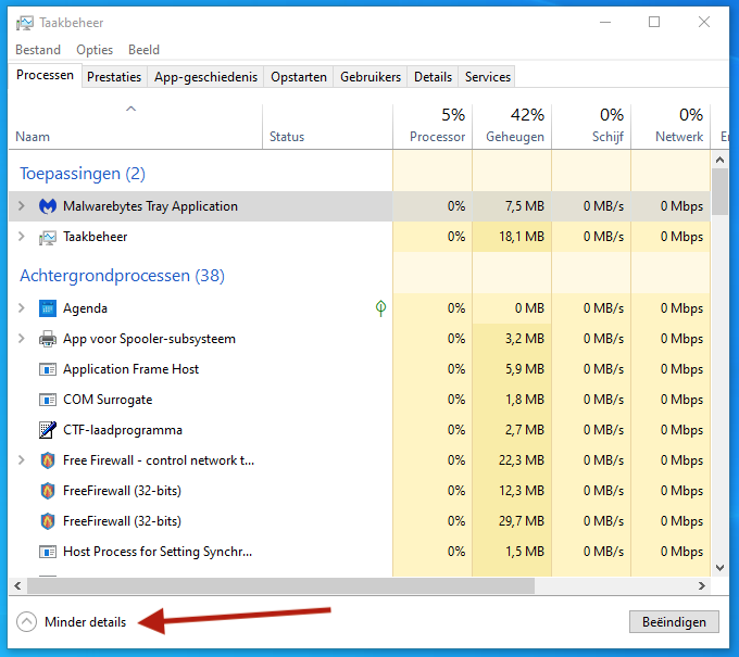 3. Als je meer toepassingen en draaiende achtergrondprocessen wilt zien dan klik je linksonder op Meer details. Ook hier kun je toepassingen en achtergrondprocessen beëindigen. Doe dit met beleid en alleen als ze problemen veroorzaken.