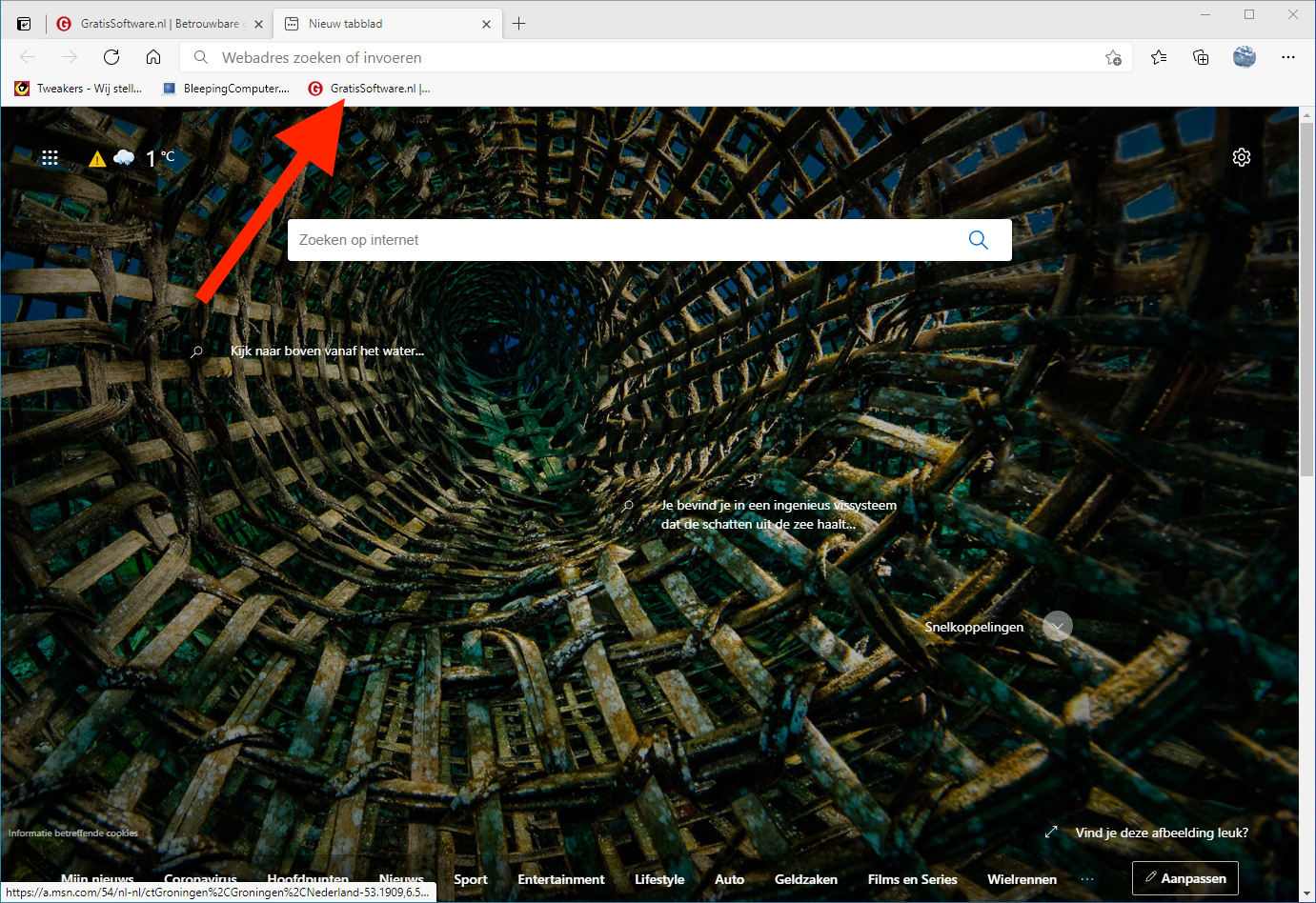 3. Als je nu Edge opent of een nieuw tabblad opent (klik op +) dan zie je je favoriete website, zoals GratisSoftware.nl, staan in de werkbalk Favorieten en kun je direct erop klikken om naar de website te gaan. Zo hoef je nooit meer te zoeken of een adres in te typen om naar de website te gaan: