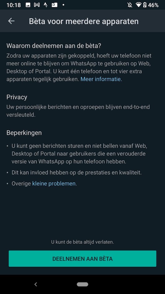 Je hebt minimaal versie 2.21.180.14 van WhatsApp voor iOS nodig en versie 2.21.18.17 voor Android om deel te kunnen nemen aan de bèta voor meerdere apparaten. Je kunt natuurlijk ook nog een paar weken of maanden wachten totdat de functie beter getest voor iedereen beschikbaar komt (zonder dat je aan de test hoeft mee te doen).