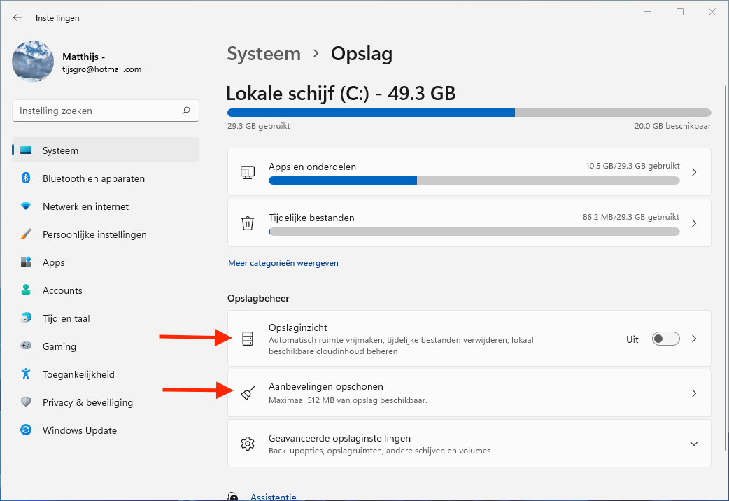Onder Opslag | Aanbevelingen opschonen kun je behalve de Tijdelijke bestanden die we net ook opgeruimd hebben verder nog Grote of ongebruikte bestanden, Bestanden gesynchroniseerd met de cloud (als je OneDrive gebruikt) en Ongebruikte apps opruimen.