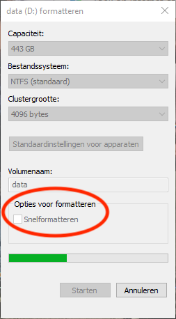 Als je een schijf snel formatteert in Windows dan wordt alleen aangegeven dat de plek van de bestanden vrij is, maar de gegevens worden niet overschreven (en zijn terug te halen met speciale software). Kies dus nooit voor snel formatteren als je een pc, schijf of usb stick weggeeft of verkoopt. Haal altijd het vinkje weg!