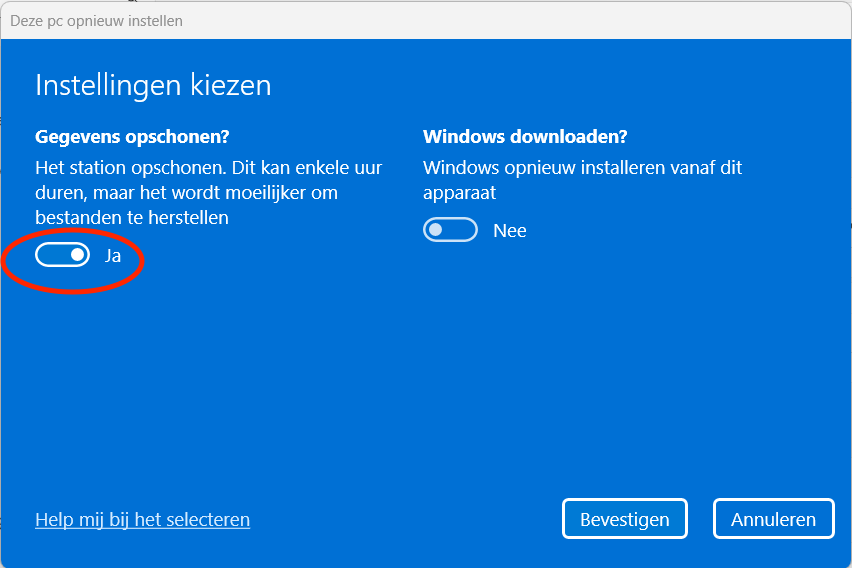 4. Zet de schakelaar bij Gegevens opschonen op Ja! Nu worden alle gegevens en schijven eerst overschreven alvorens Windows opnieuw geïnstalleerd wordt. Selecteer ook alle schijven van je pc, mocht hiernaar gevraagd worden.