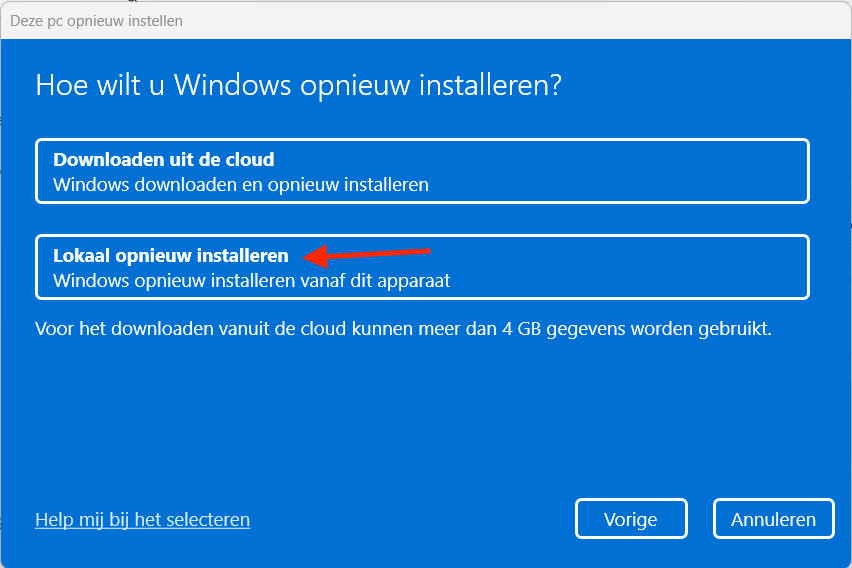 2. Kies Lokaal opnieuw installeren (anders moet Windows uit de cloud gedownload worden voor herinstallatie)