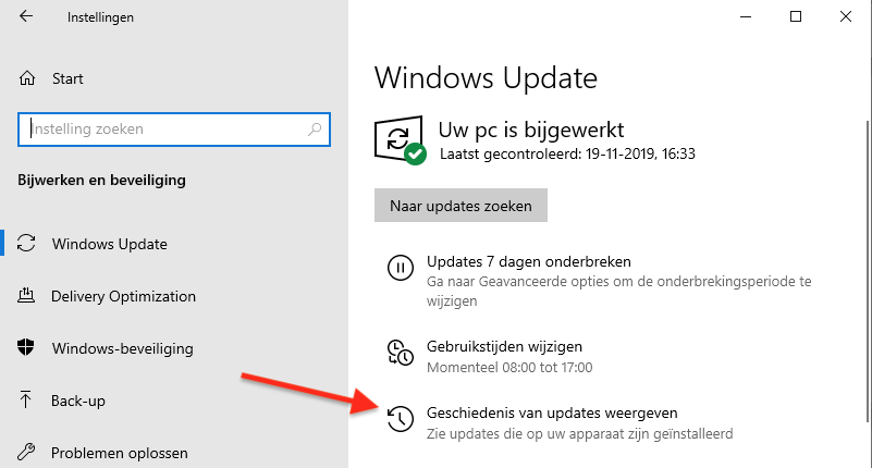 1. Ga naar Instellingen | Bijwerken en beveiliging | Windows Update | Geschiedenis van updates weergeven