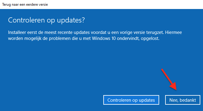3. Microsoft vraagt nu of je nog op updates wilt controleren zodat problemen misschien alsnog opgelost kunnen worden. Als je de laatste updates hebt dan heeft dit geen zin en kies je Nee, bedankt