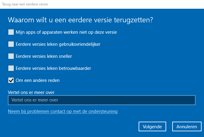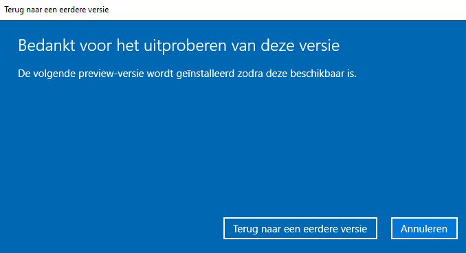 Als je de nieuwste versie van Windows 10 hebt geïnstalleerd en deze bevalt niet of functioneert niet goed (apps werken niet of er zijn hardware-problemen) dan kun je ook makkelijk teruggaan naar een vorige versie van Windows 10. Zonder dat je alles opnieuw hoeft te installeren.