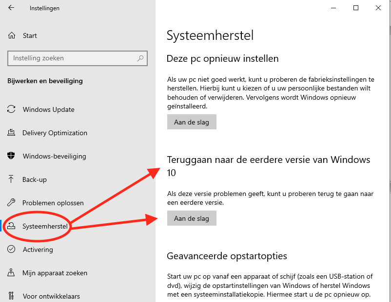 Als je Windows 10 versie 2004 (of 1903, of een andere voorjaarsuitgave van Windows 10) hebt dan moet je via Systeemherstel teruggaan naar een vorige versie. Dit geldt ook als je de upgrade naar 20H2 of 1909 hebt gedaan via een eerdere versie van Windows 10 die ouder is dan die van een half jaar daarvoor.