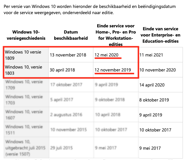 Windows 10 1803 tot 12 november 2019 en Windows 10 1809 tot 12 mei 2020. Oudere versies, zoals 1709, krijgen nu geen updates meer. Windows 10 1903, dat eind mei zal uitkomen, zal tot ongeveer november 2020 te gebruiken zijn. Na die anderhalf jaar moet je updaten naar een nieuwe onderdelenupdate.