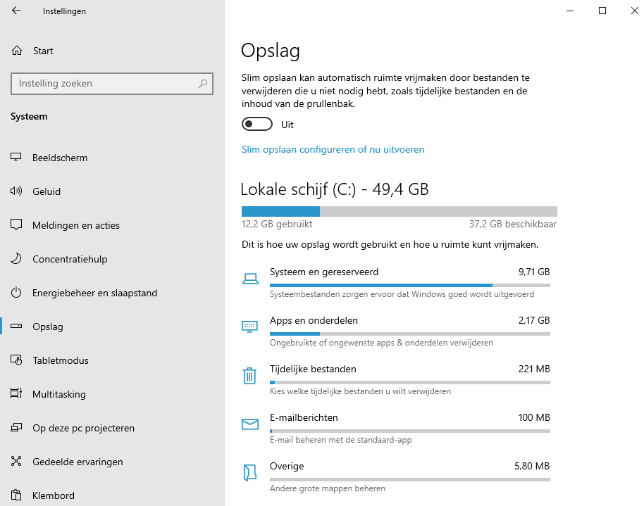Onder Instellingen | Systeem | Opslag wordt de gebruikte opslag op je schijf nu per categorie weergegeven. Het nieuwe onderdeel Systeem en gereserveerd is hier ook zichtbaar (vanaf nu wordt 7 GB opslagruimte gereserveerd voor updates en systeemtaken). Verder zie je bijvoorbeeld Apps en onderdelen, Tijdelijke bestanden, E-mailberichten, Documenten, Afbeeldingen, Muziek, Video's en meer zodat je in één oogopslag ziet waar je ruimte voor gebruikt wordt.