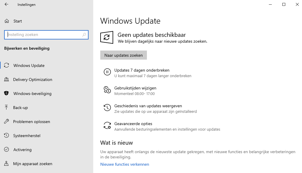 Nieuw is de mogelijkheid om Windows Update voor zeven dagen te onderbreken. Handig als je even wilt afwachten of nieuwe updates geen problemen veroorzaken. Nadeel is wel dat daarna automatisch alle beschikbare updates worden binnengehaald. En langer dan zeven dagen pauzeren kan ook niet. De pauzeknop is te vinden bij Instellingen | Bijwerken en beveiliging - Windows Update.