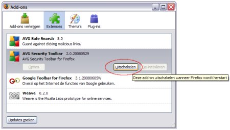 Als u per ongeluk AVG met de Security Toolbar hebt geïnstalleerd dan kunt u die later alsnog uitschakelen in Internet Explorer en Firefox.