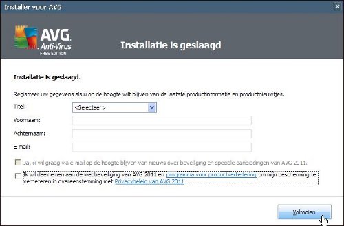 9. Dan het volgende scherm al de installatie geslaagd is. U kunt ervoor kiezen om AVG te helpen en gegevens te verschaffen over virussen op uw pc, dan moet u een vinkje zetten bij Ja, ik wil deelnemen aan webbeveiliging... . Dit hoeft natuurlijk niet. Als u dit niet wilt hoeft u niks te doen en kunt u Volgende klikken. In dit scherm kunt u ook nieuws en aanbiedingen van AVG 2011 krijgen door uw e-mail-adres in te vullen. Dit hoeft ook niet. Wij zouden zelf geen e-mail-adres invullen en geen vinkje plaatsen.