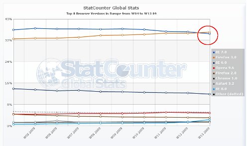 En het wordt steeds moeilijker voor Internet Explorer, logisch in die zin dat IE van mindere kwaliteit is. Vooral nu blijkt dat IE8 flink tegenvalt.