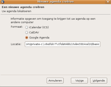 Selecteer in het nieuwe venster de optie Google Agenda en plak het eerder gekopieerde adres in het Locatie veld