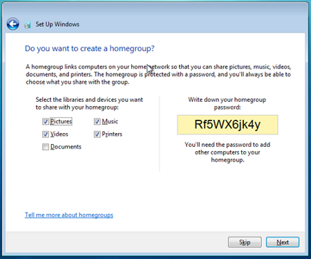 Als Windows 7 geïnstalleerd wordt krijg je de mogelijkheid om een HomeGroup te maken. Hiermee kun je muziek, foto's, video's, documenten en printers delen met meerdere computers op het thuisnetwerk. Onderstaande afbeelding laat het HomeGroup-scherm zien.