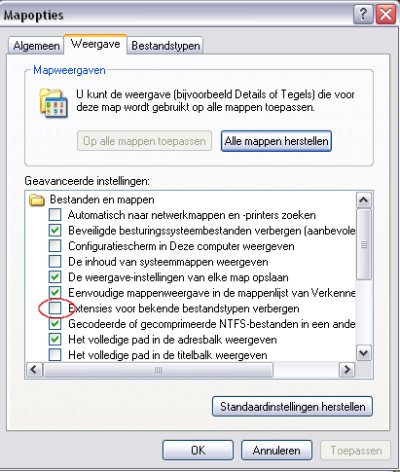 Haal het vinkje weg bij Extensies voor bekende bestandstypen verbergen