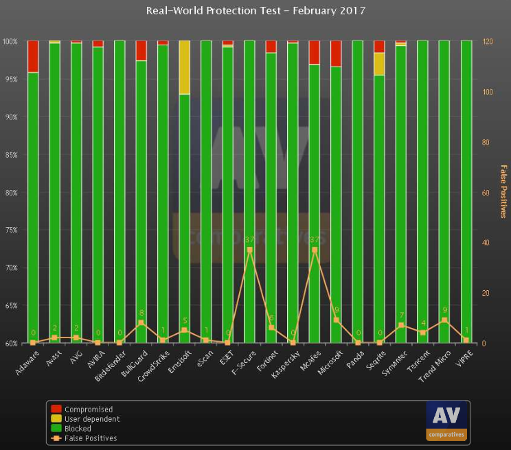AV Comparatives zoekt voor de tests op internet naar schadelijke sites die malware op je pc proberen te zetten. In februari 2017 werden 383 kwaadaardige websites die malware aanboden via drive-by downloads gebruikt in de test. Gekeken werd hoeveel bedreigingen geblokkeerd werden door de virusscanners in deze periode. Hieronder de resultaten.