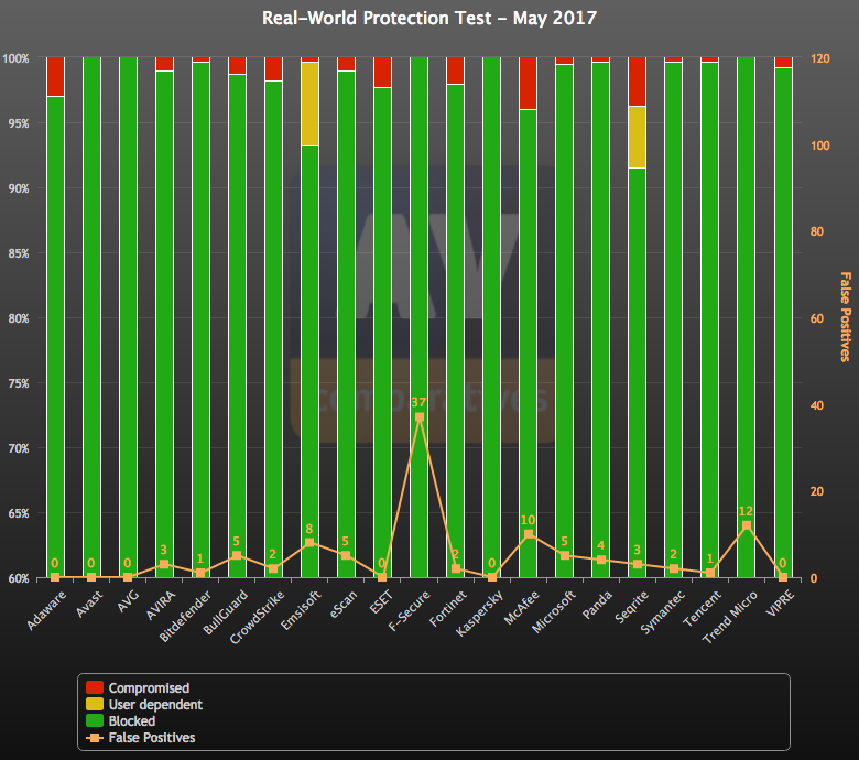 AV Comparatives zoekt voor de tests op internet naar schadelijke sites die malware op je pc proberen te zetten. In mei 2017 werden 398 kwaadaardige websites die malware aanboden via drive-by downloads gebruikt in de test. Gekeken werd hoeveel bedreigingen geblokkeerd werden door de virusscanners in deze periode. Hieronder de resultaten.