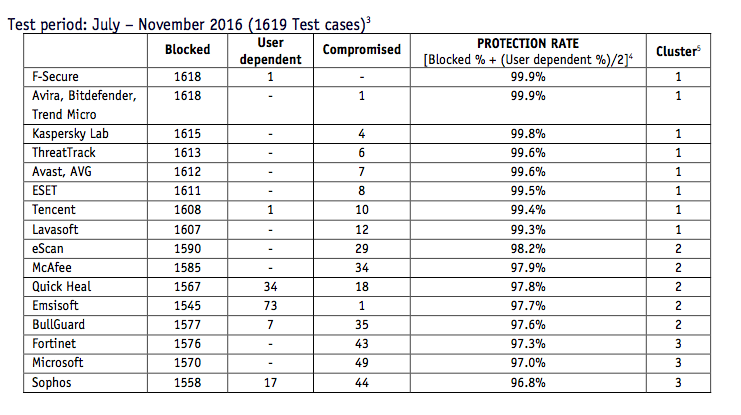 F-Secure was de enige virusscanner die alles tegenhield, op één virus na - waarbij de gebruiker moest beslissen of het geblokkeerd moest worden of niet. Avira, Bitdefender en Trend Micro hadden één slippertje: een malware-exemplaar dat ze niet tegenhielden. Kaspersky liet er vier door in deze periode van vijf maanden, de betaalde variant van AVG en de gratis versie van Avast misten zeven virussen, Ad-Aware (Lavasoft) 12, McAfee 34, Sophos 44 en Microsoft Security Essentials (MSE) 49.