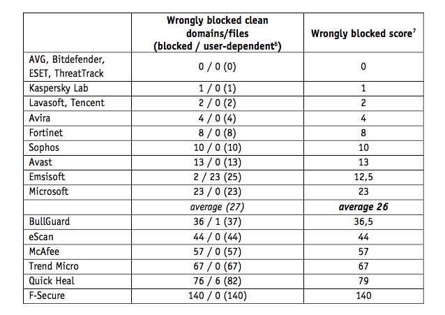 McAfee deed het niet zo goed met 57 vals positieve meldingen en Trend Micro (dat goede bescherming bood) had er maar liefst 67. Ronduit slecht op dit gebied deed F-Secure het: bij 140 schone websites en bestanden gaf de virusscanner vals alarm! Dit is de reden dat F-Secure ondanks de adequate protectie toch lager wordt ingeschat door AV Comparatives. Zoveel vals positieve meldingen zorgen voor een slechte gebruikerservaring.