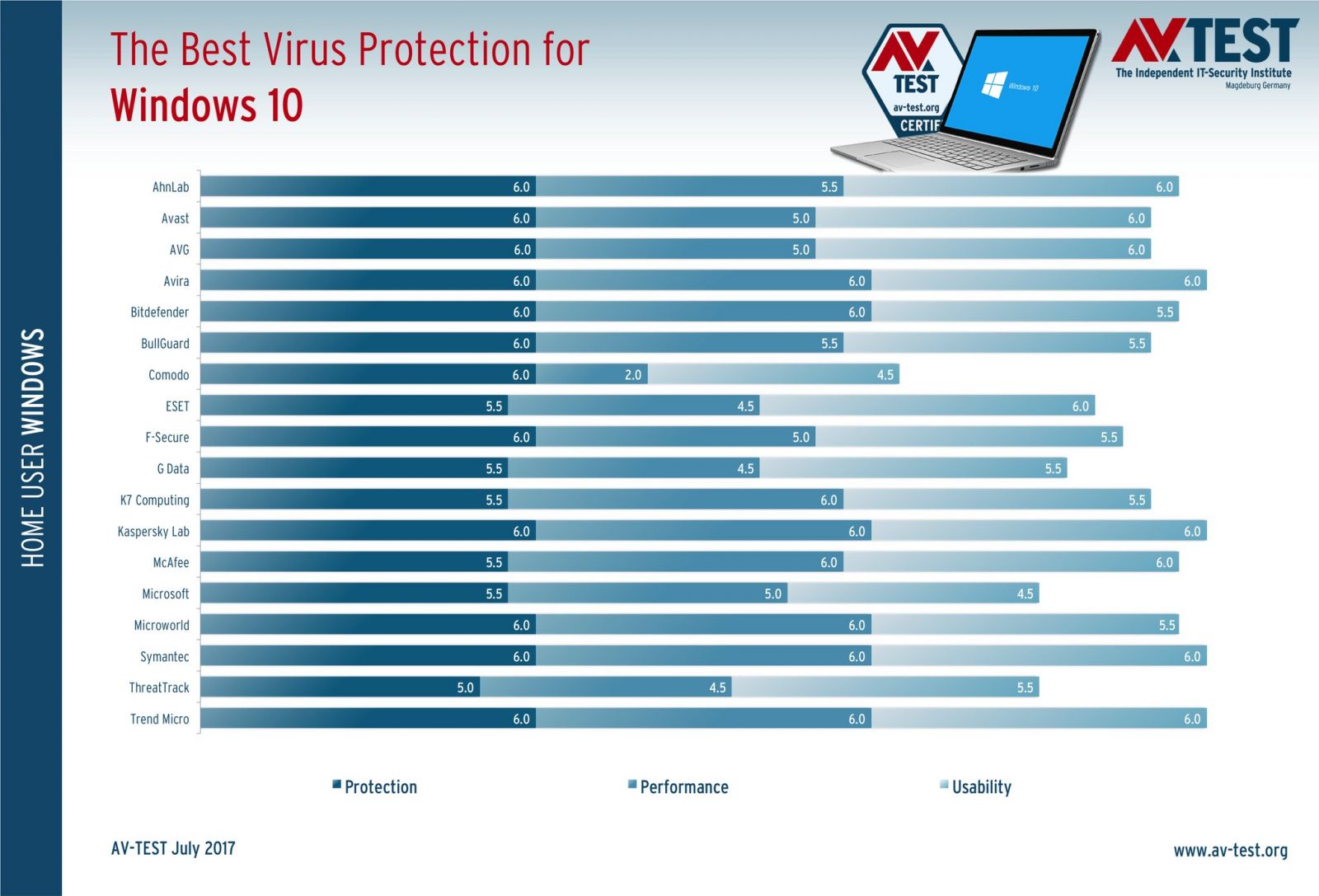 Het Duitse test-instituut AV-Test doet enkele malen per jaar onderzoek naar de mate van bescherming, de systeemvertraging en het aantal vals positieven van virusscanners. Bij de test van mei/juni, die net gepubliceerd is, werden 18 anti-virus producten voor Windows 10 beoordeeld. Er werd gekeken hoe goed ze bescherming boden tegen 202 zero-day aanvallen (nieuwe bedreigingen) en ruim tienduizend al wijdverspreide virussen.