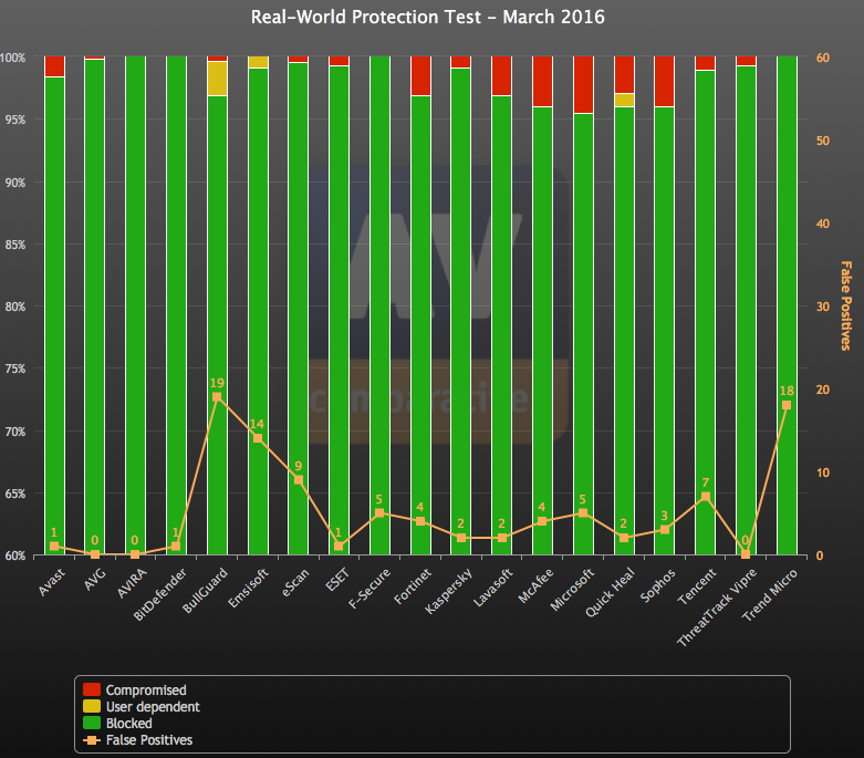 AV Comparatives zoekt voor de test op internet naar schadelijke sites die malware op je pc proberen te zetten. In maart 2016 gebruikte AV Comparatives 449 kwaadaardige sites die malware aanboden via drive-by downloads. Gekeken werd hoeveel bedreigingen geblokkeerd werden door de virusscanners in deze periode. Hieronder de resultaten.