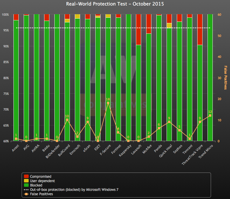 AV Comparatives zoekt voor de test op internet naar schadelijke sites die malware op je pc proberen te zetten. In oktober 2015 gebruikte AV Comparatives 393 kwaadaardige sites die malware aanboden via drive-by downloads. Gekeken werd hoeveel bedreigingen geblokkeerd werden door de virusscanners in deze periode. Hieronder de resultaten.
