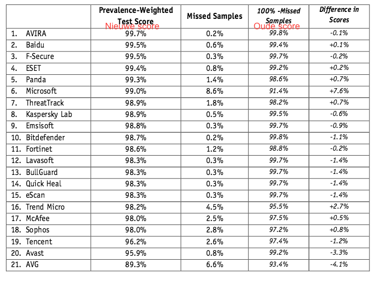 Dat de gewogen score een groot voordeel voor Microsofts Windows Defender oplevert is een beetje kwestieus, maar ik denk dat de methode op zich wel goed is. Microsoft gaat hierdoor van een laatste naar een zesde plek. AVG blijft laatste en wordt nog slechter. Avast daalt flink naar de een na laatste plek omdat de virusscanner blijkbaar relatief te veel wijdverspreide virussen doorlaat. Ook TrendMicro profiteert nog redelijk van de gewogen score. Bij de andere scanners zijn de verschillen tot een procentje of minder beperkt. De test betreft trouwens file detection, een statische test, die niet bescherming door gedragsblokkering of webbescherming bekijkt.