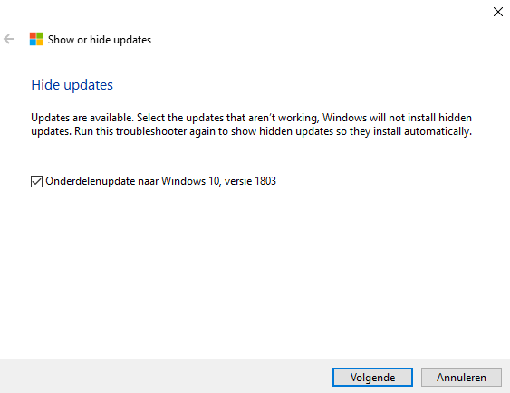 - Als het goed is staat hier nu Onderdelenupdate Windows 10, 1809 om te verbergen (anders moet je het weer proberen als je deze update aangeboden hebt gekregen, maar nog niet geïnstalleerd). Selecteer deze en kies Volgende.