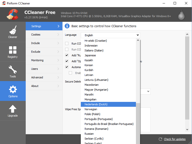 Onder Options | Settings - Language kun je Nederlands als taal van CCleaner instellen, mocht dat al niet automatisch tijdens de installatie gebeurd zijn