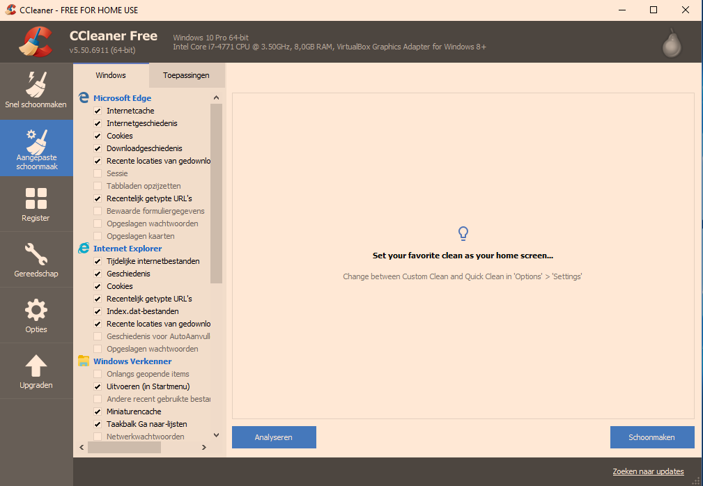 Het normale startscherm van CCleaner vind je terug onder Aangepaste schoonmaak: