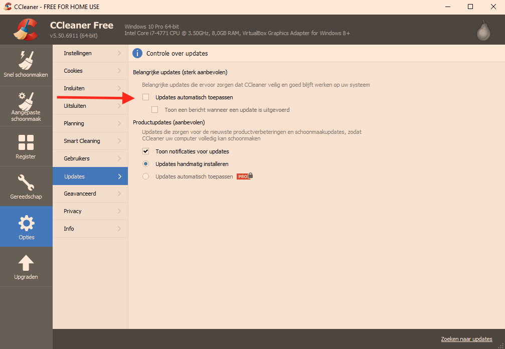 Nu krijg je in ieder geval meer mogelijkheden om dit update-mechanisme naar wens in te stellen. Als je naar Opties | Updates gaat dan kun je het vinkje weghalen bij Updates automatisch toepassen als je daar niet van gediend bent. Let op: dit betreft alleen 'belangrijke updates' die gepusht worden door CCleaner. De gewone maandelijkse updates moet je in de gratis versie handmatig blijven installeren.